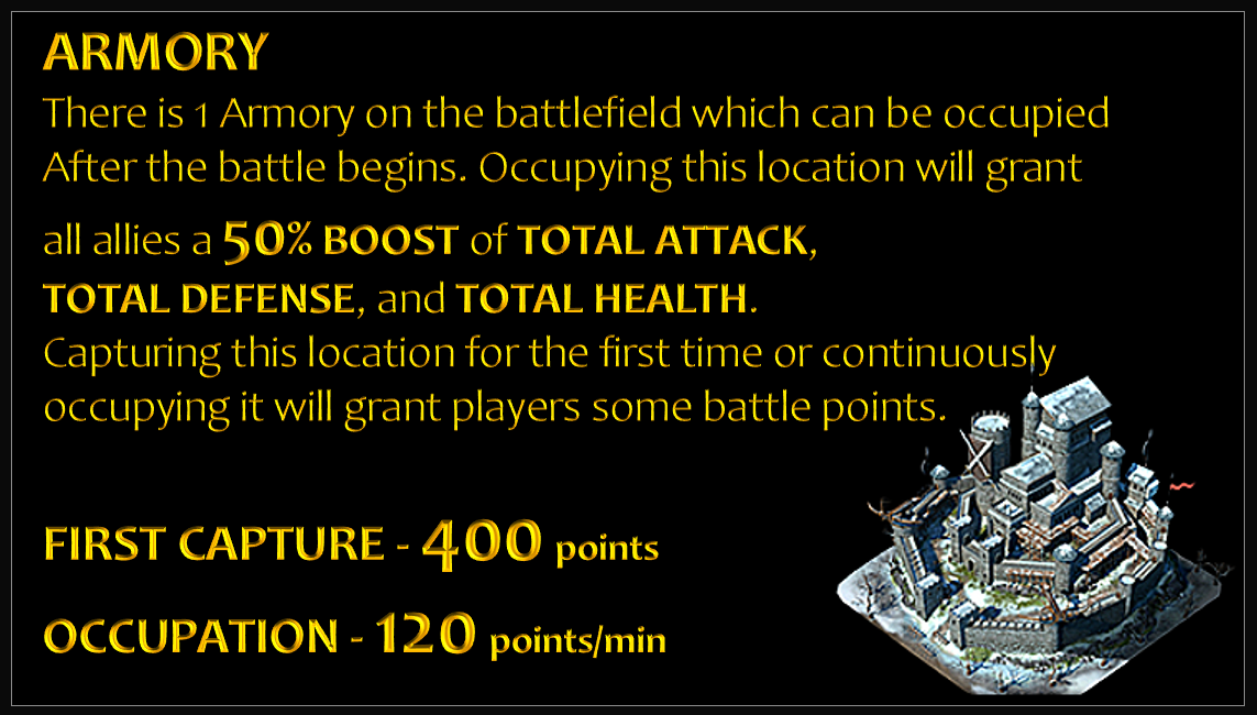 Armory gives some big buffs. There was a similar building called Tower of Warrior in the Alliance Conquest. The Warrior Tower gives 20% Attack and Health buffs. In the Siege of Winterfell, the Armory gives, 50% of Total Attack, Total Defence, and Total Health. It’s a great buff compared to the Warrior Tower. Prioritize Armory would change the match results depending on an opponent.