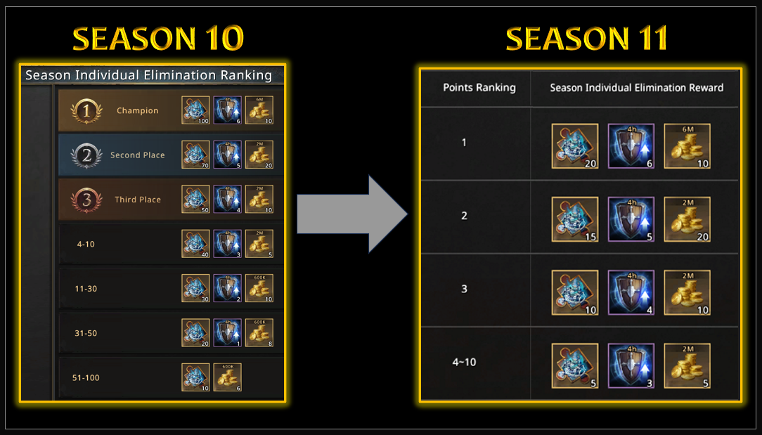 Whole alliance members will receive 8 to 30 skin fragments depending on the Alliance Rank. I can see why DEP’s new management team is prioritizing the Alliance Ranking over the Individual Elimination Ranking. Even the second-place Alliance rewards are better than the Top Elimination rewards. If you think about the play cost with the individual rewards it is not worth to chase. Alliance reward is more beneficial to the alliance and the alliance members. While others are chasing the 20 fragments for individuals, DEP is chasing the 30 fragments for 100 members.