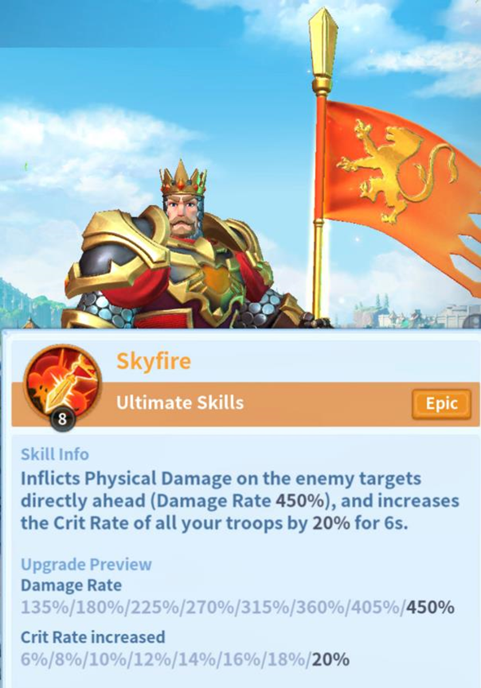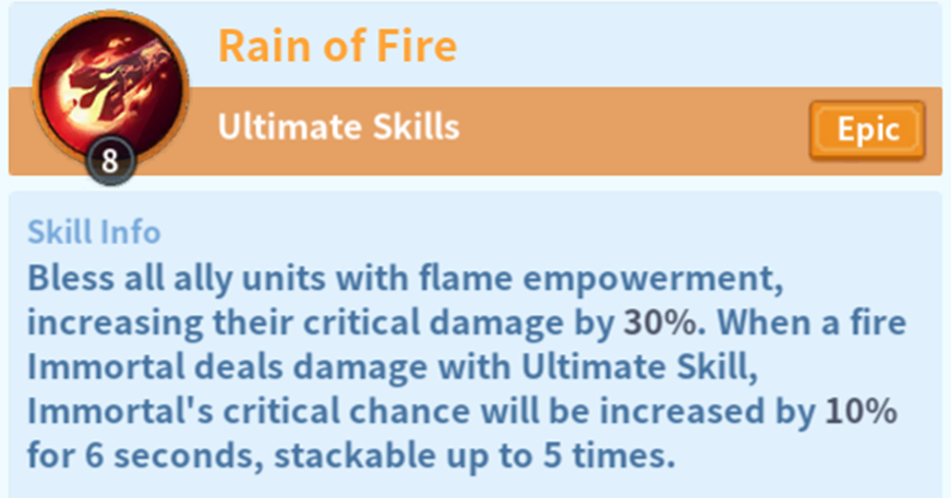 William's Ultimate Ability Skyfire reads: "Increases the Crit Rate of all your troops by x% for 6s." In comparison, Trajan's Ultimate Ability Rain of Fire states: "... Immortal’s critical chance will be increased by 10% for 6 seconds, stackable up to 5 times." The apparent similarity raises a crucial question: What distinguishes "boosting the crit rate of troops" from "boosting the crit chance of immortals"? Is one superior to the other?