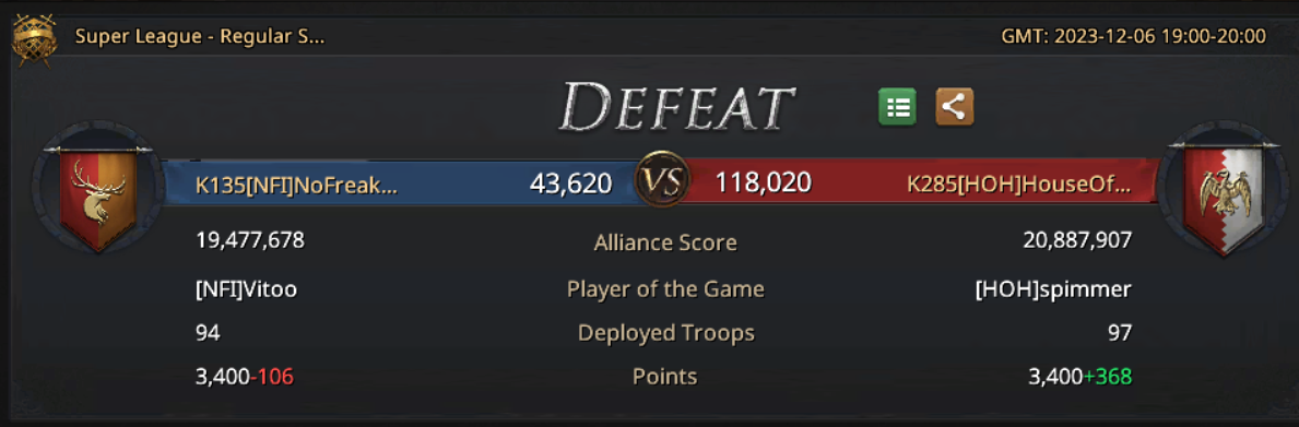The alliance was in voice chat to make giving instructions easier. I was mentally going over how to reinforce the different people. Some I know but there are a lot more I don’t. Next thing I know, the match had begun. Rallies popped up left and right. Racers were off to the buildings they were assigned too. The map chaos had begun as marches were pouring out en masse all over the map. Some were solo marches out to take a building or knock someone out. Some were rallies set to knock HOHs strongest out. HOH came out and dominated early on, taking most of the buildings. We also managed to get a couple. There was an endless parade of rallies for every specialty imaginable. HOH was able to knock us from some buildings, and we managed to return the favor a couple times too. I feel like I had spent more time in the rally screen and the hospital screen than seeing the actual match play out. I was in the zone, unaware of both the score and the time.