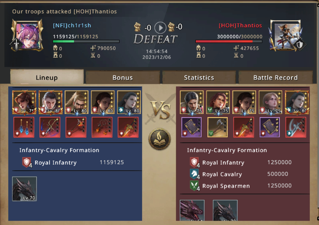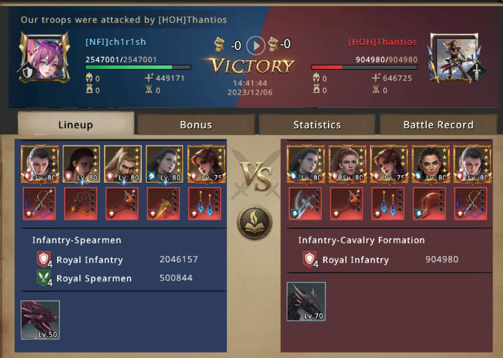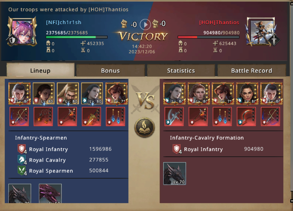 When the bubbles dropped a couple HOH players hit me directly, fights I had lost. To be fair I didn’t realize right away that I was even being attacked as I was joining rally after rally in an endless loop lol. The next time I got the alert, I wasn’t even sure if there were troops inside as I was reinforcing some buildings and joining rallies like a crazy woman, but figured lets see what happens. If nothing else I will get some of those juicy stats on the battle report. HOH Thantios was the one paying me a visit. He sped into my castle and I fully expected to see the you know you lost gurl report lol
