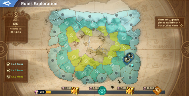 This part of Odin’s tale also resonates within the game’s Ruins Exploration. Lords upon entering the game is provided a map of ruins to explore and gather from while collecting puzzle pieces from three zones. Please visit this guide produced by Gabben explaining ruins in greater detail.