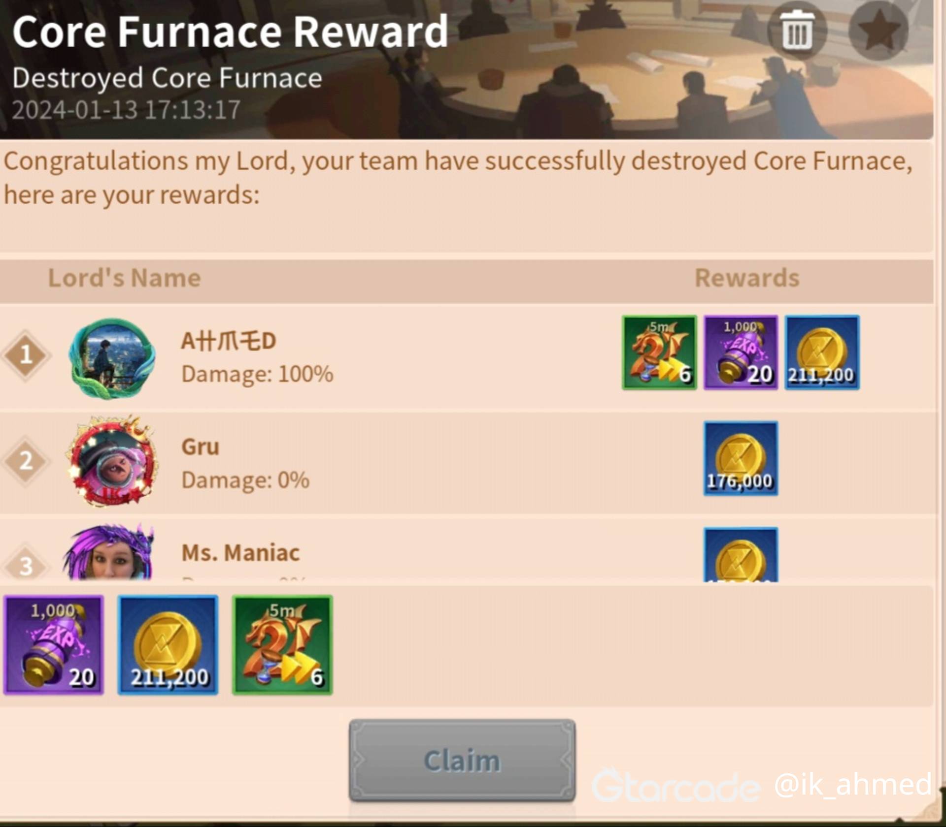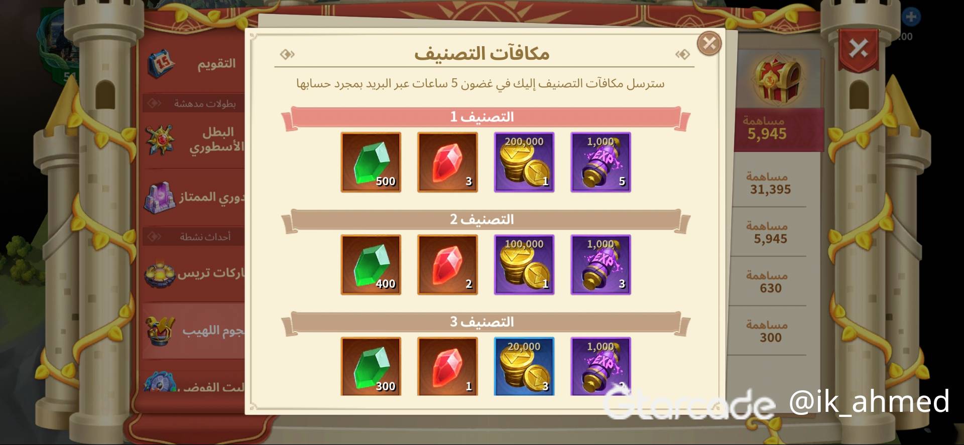 وبعد نهاية الحدث يحصل التحالف صاحب اعلى نقاط على جوائز يتم تجميع النقاط على كل فرن يتم تدميره ويختلف حسب المستويات