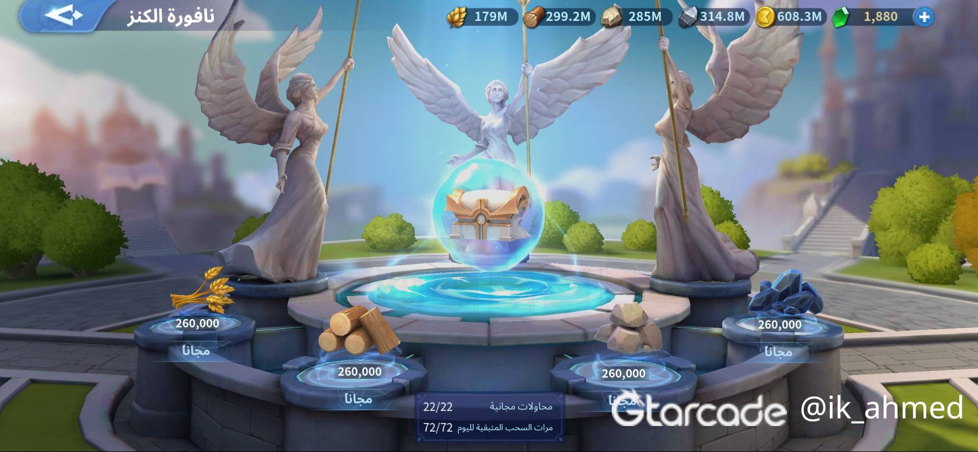 عن طريق نافورة الكنز التى تعطيك محاولات مجانية للحصول على موارد ويمكنك شراء المزيد عن طريق الجواهر