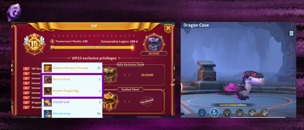Inside this coveted chest, you'll find the Shadow Dragon Egg. Hatch it in your Dragon Cave to welcome a baby Melanthios, marking the start of your journey in mastering shadow power.