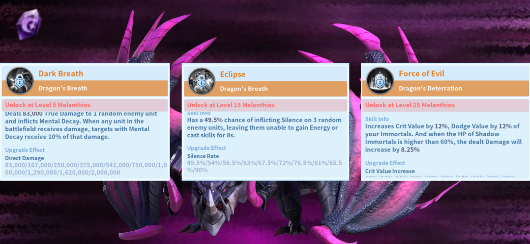 Like other dragons in the game, upgrading Melanthios unlocks its skills, starting at level 5. Each skill has unique effects, and they can be leveled up through "domestication" using Dragon Crystals to become even more powerful.