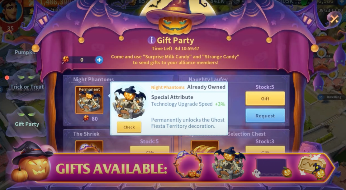 Perhaps the most interesting part of this event is that not only are there many limited cosmetic items to obtain for yourself, but you can also send gifts to members of your alliance! Below you can see how many Strange Candies and Surprise Milk Candies it will cost to gift each item: