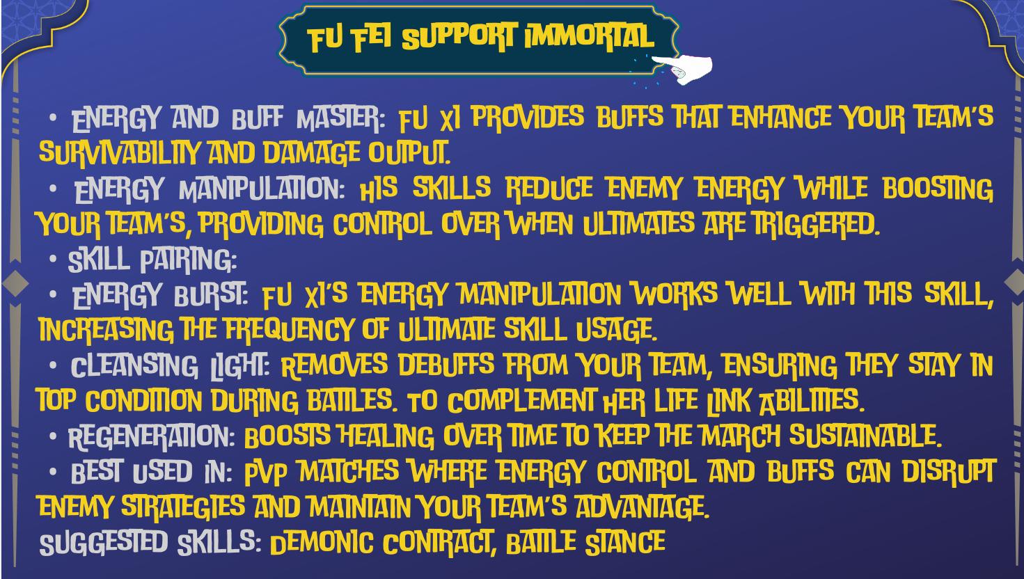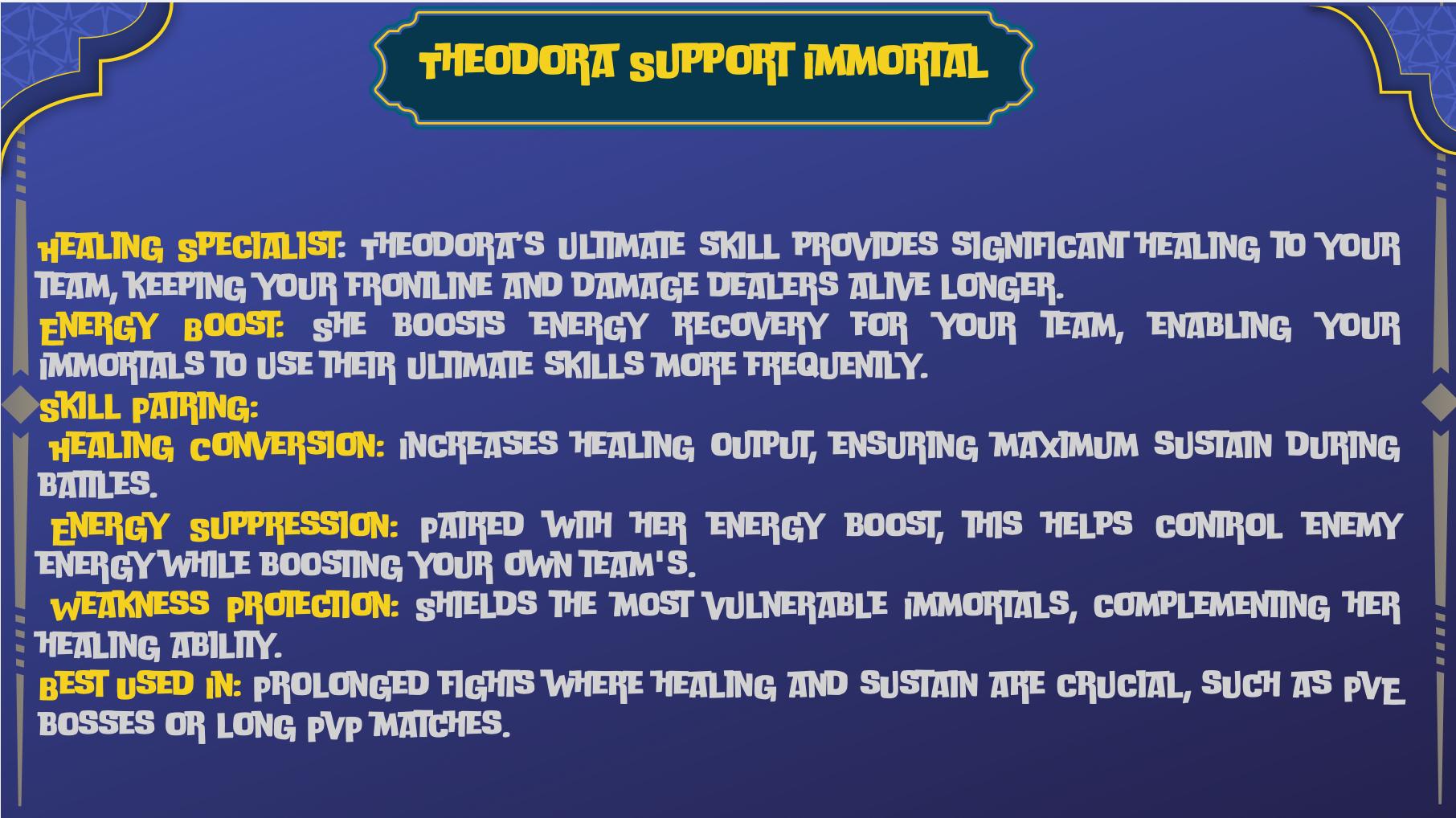 Support: Immortals, for example,Tomyris, Qin Dido, or Theodora etc, enhance the effectiveness of your team with healing or buffs. Pair them with skills that extend buffs, Physical defence, that inflicts wounds to enemies preventing healling, or increase energy regeneration.