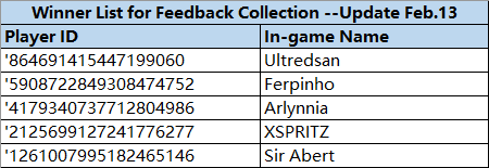 Winner list is as follows. Please check your in-game mail for the rewards.