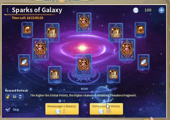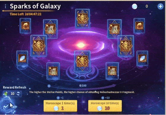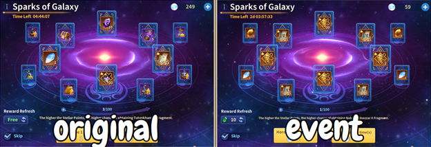 Sparks of Galaxy is a weekly semi-premium event in which players can obtain Shadow and Holy immortal fragments and their exclusive artifact shards. The event lasts three days at a time and will automatically refresh once every 24 hours. Players get a free roll every day. In the previous iteration, 10 of the 12 slots were filled with various resource chests, experience scrolls, speedups, Dragon Essence, and Philosopher’s Stones. The other 2 were occupied by 30 immortal fragments and 3 exclusive artifact shards. Players could use Frosty Orbs, which are purchasable with Gems and currency, to play. Every used orb will reward 1 Horo Point if the player does not pull the immortal fragments. Once it reaches 100 Horo Points, the next pull will guarantee the fragments. In the fourth anniversary version of Sparks of Galaxy, all slots are replaced with more valuable items. There are 2 slots of 5 Dragon Crystals, 2 slots of Dragon Essence, 3 slots of 2 immortal fragments, 4 slots of an exclusive artifact shard, and 1 slot of 30 immortal fragments. The Horo Points will also reset after receiving any immortal fragment.