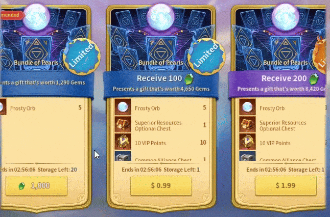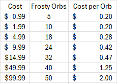Players can purchase bundles of 5, 10, 18, and 24 Frosty Orbs for $0.99, $1.99, $4.99, and $9.99 once a day and bundles of 32, 40, and 50 Frosty Orbs for $14.99, $49.99, and $99.99 5 times a day. The best values are the first 3 bundles have the best value before they drop significantly. You could make a case for purchasing the first 5 bundles, but I would absolutely refrain from buying the last ones as the price increases by more than double. Players can also purchase 5 orbs for 1,000 Gems 20 times a day.