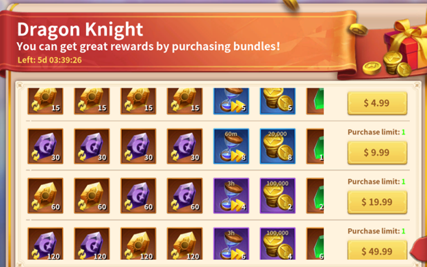 Holy and Shadow Dragon Shards are extremely valuable for players who aspire to build and max Holy and Shadow Dragons. Besides the monthly VIP code and the monthly GTArcade pack that gives 100 shards each, the cheapest options are the weekly Dragon Knight bundles. For $4.99, $9.99, $19.99, $49.99, and $99.99, you get 60, 120, 240, 480, and 600 crystals respectively. The crystals in the first 3 packs come out to be $0.08 each while the next two are worth $0.10 and $0.16. For Dragon Essences, there are plenty of free ways to get them, so they are not worth a lot. Time Rift Breaker shop has 5 a week, clearing tiers of Open Arena also reward essences, Throne of the Supreme shop has 15 a month, and you can also get 30 a month from free GTArcade packs. Due to the numerous ways to get essences for free, we’re going to omit the value of them when considering Sparks of Galaxy.