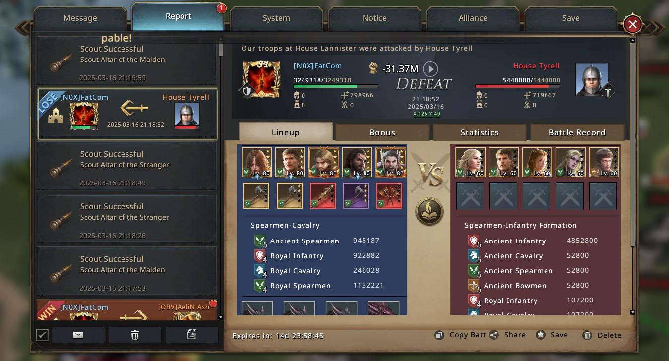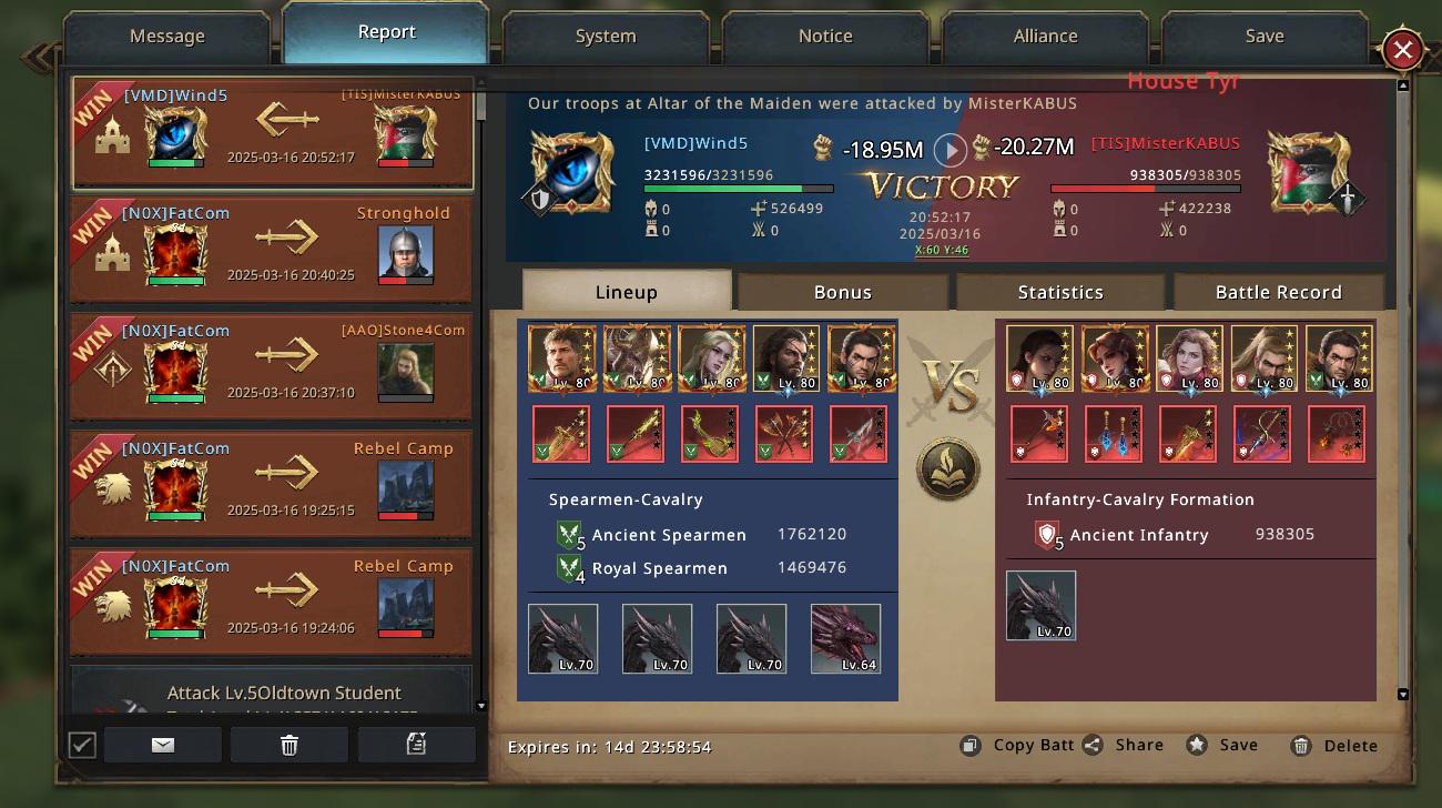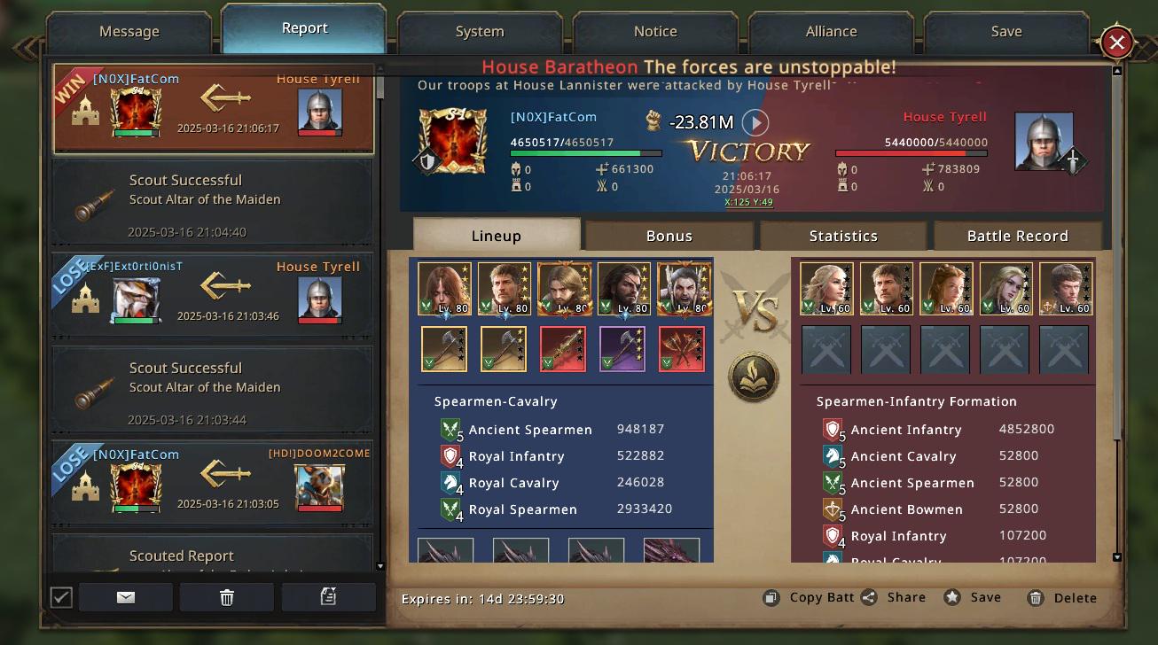 The game is actually going well for once, unlike our previous attempts, and we’re on a solid path to 2nd place. But just as the big mine is about to open, the unthinkable happens. Again! What a surprise! Not!!! House Tyrell, the ones attacking us, went for Troop Stats. They’re Inf, and we were defending the House with an Inf account, but guess what? Their Inf became stronger. And we all know what that means... we lost the House again. That’s now 3 games in a row where we lose the house.