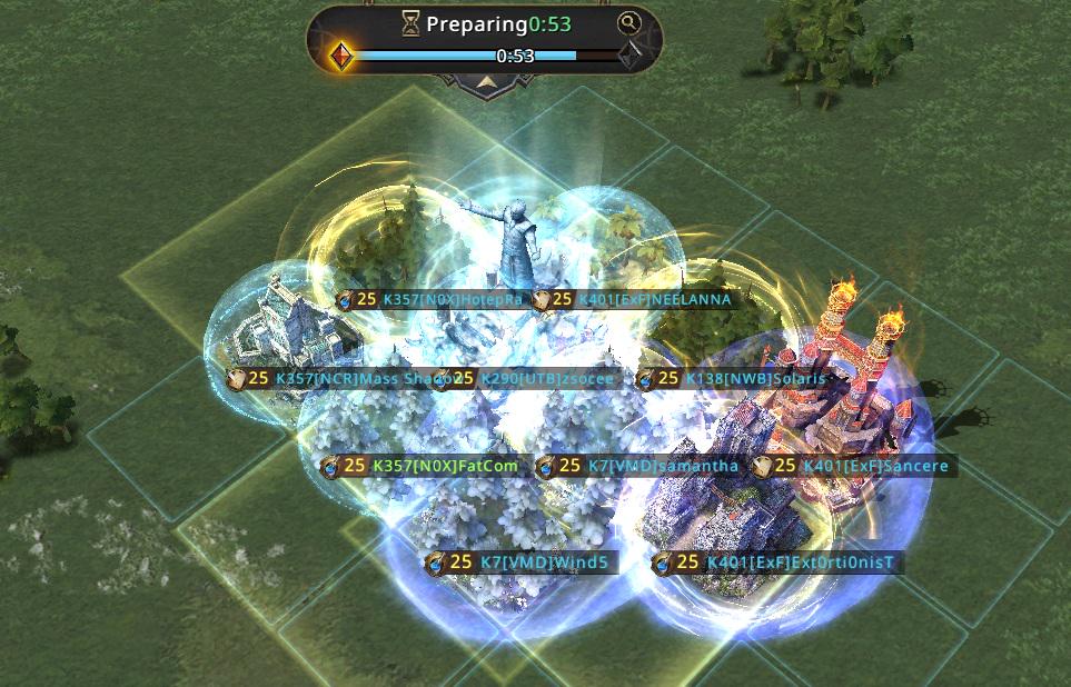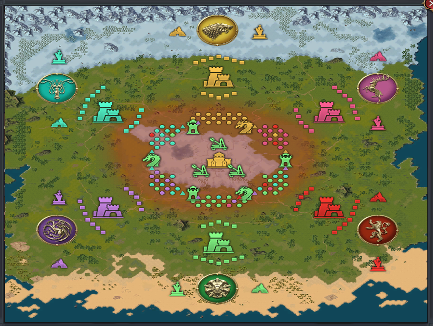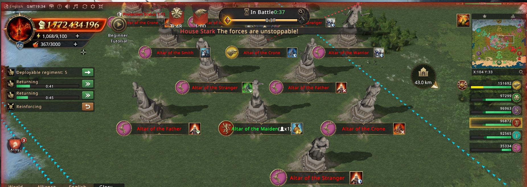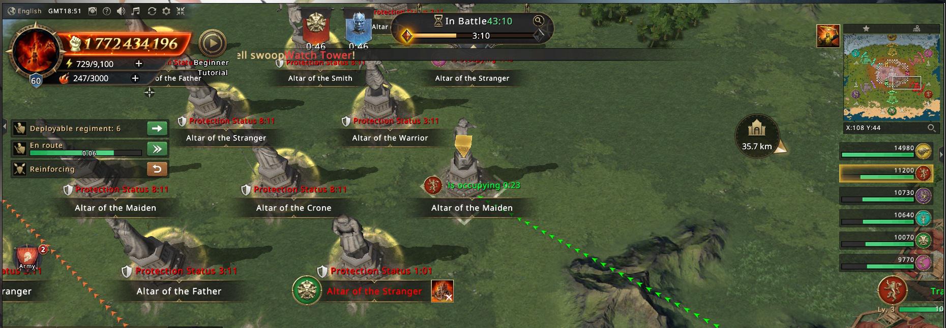 I get kicked just as the small mines are about to open, and I notice a new strategy in AoH. At this stage, everyone expects all Houses to focus on the mines, so they send out several random attacks on altars, hoping that while every House is busy planning for the mines, they forget to contest their altars. The entire map is "blinking"; every House is taking other Houses’ altars.