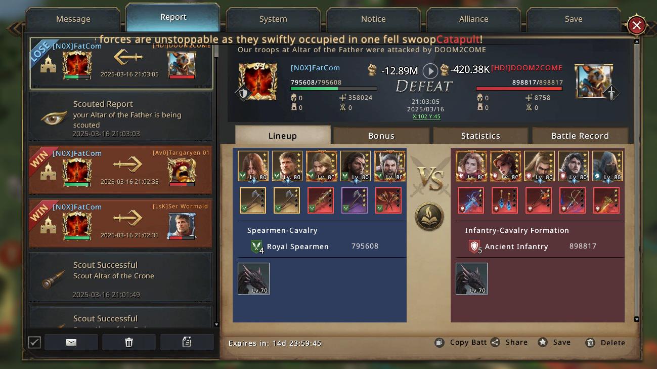 Since my lord march was free, I immediately take the House back. This is very bad for us. Not only did we each bring one army size Inf in a game with only two main Inf accounts, both F2P and without an Inf rally lead; but now everyone has to block Spears to reinforce me. And, of course, the House attacking me is Inf with heavy Inf stats thanks to their Troop Camp strategy. Just f*king great.