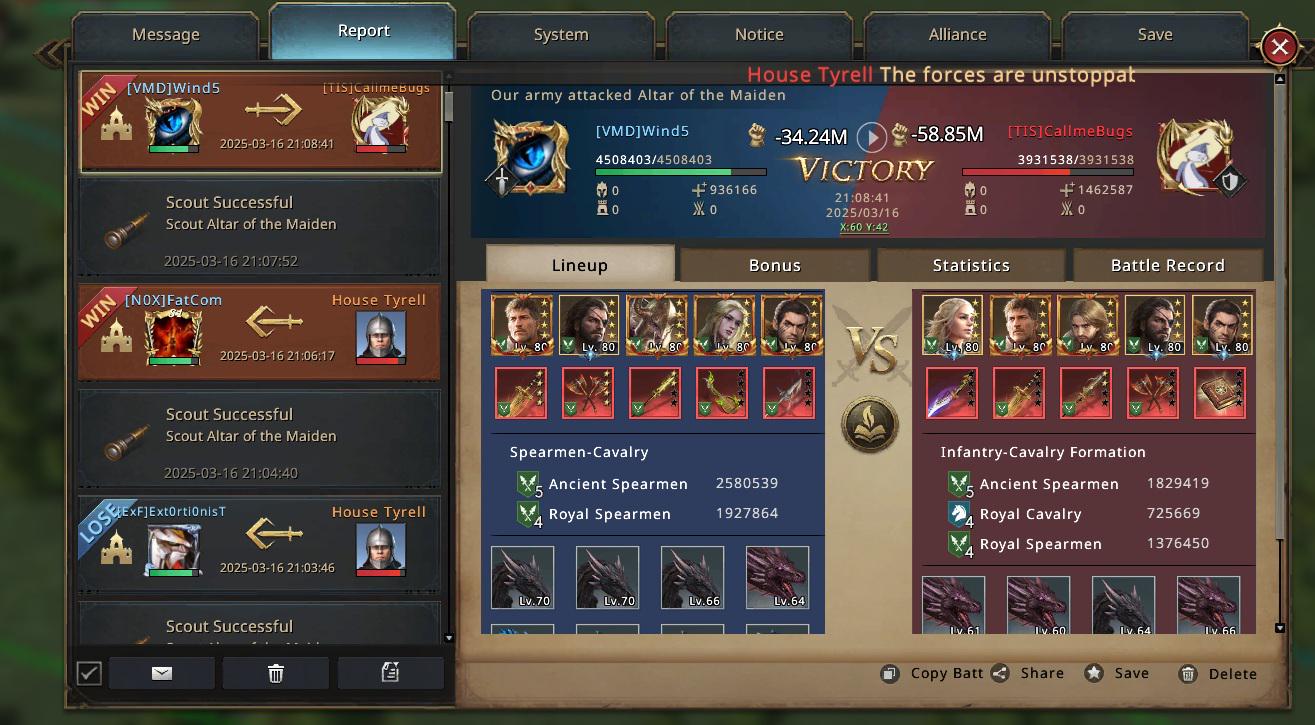 At least I get proper reinforcements. Just kidding😒Proper as in most players reinforce me in the house but with a mix of troop types. Somebody didn’t notice we swapped and kept sending Inf, while someone else probably didn’t have Spears and sent Cav instead. I appreciate the reaction, but I can’t really use these troops, and I’m afraid I’ll lose the House again. At least I got some T5 Spears. I know Hotep has them researched, but he’s still training his Cav empire, so these are probably from Wind. MVP again!