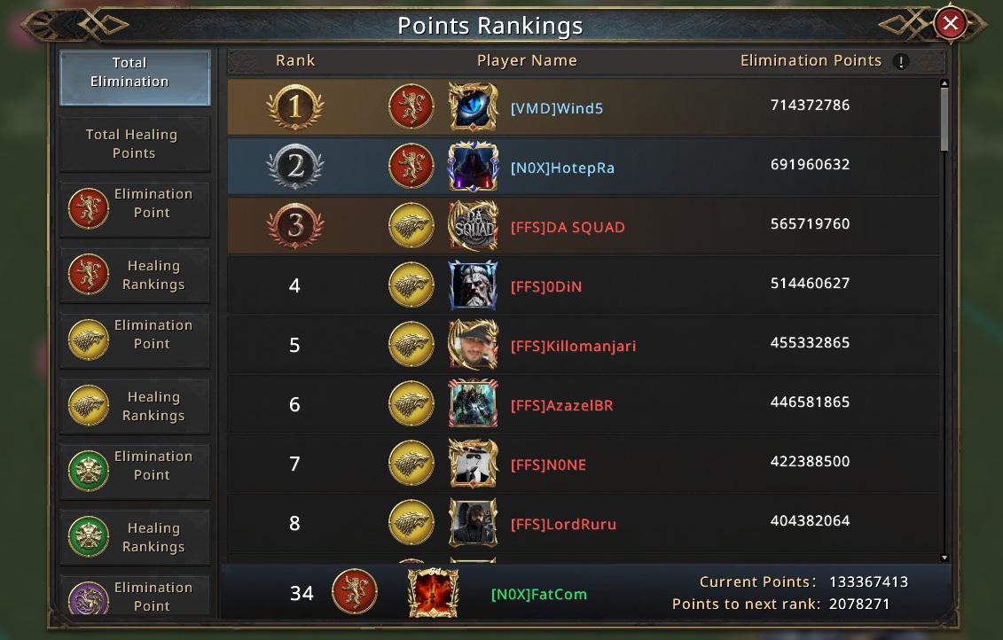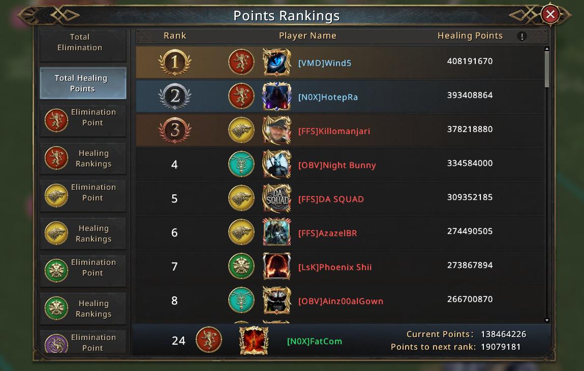 I check the rankings to see how well we performed, and it’s no surprise. My two boys are top in both Eliminations and Healing. While both had very similar results, and with all due respect to my current mentor, Hotep, I have to give this game to Wind. For the game you had, you deserve 1st place.