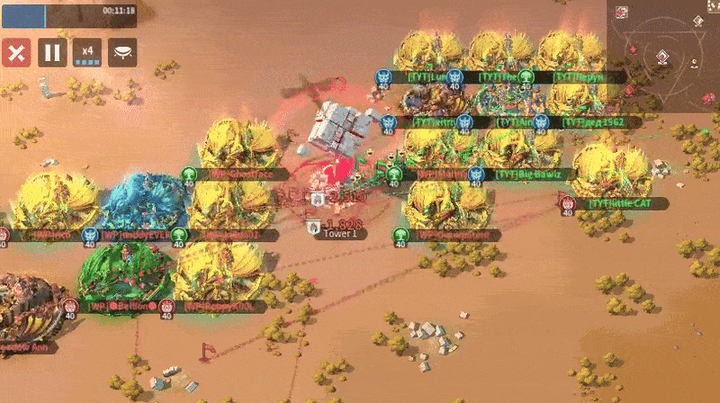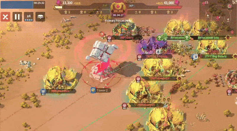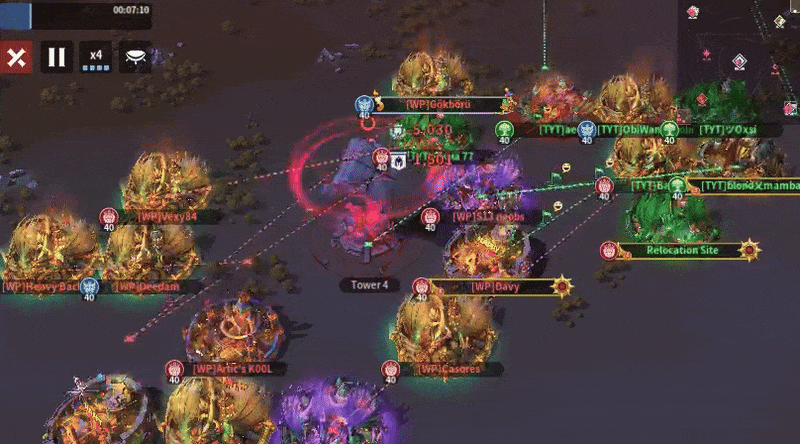 TYT relocated 8 players with an overlap to Tower 4. WP overloaded with 11 players. TYT’s relocations were as disastrous as their relocations at Tower 1. TYT started well on the right side of the tower and even made use of their top-side advantage to attempt to block relocations. Unfortunately, the positions on the top side of the tower negated the good those relocations achieved. Too many players are too far away from the tower. WP had a typical standard formation with more numbers even if 2 relocations got blocked. With WP’s organization, they should have the upper hand at Tower 4.