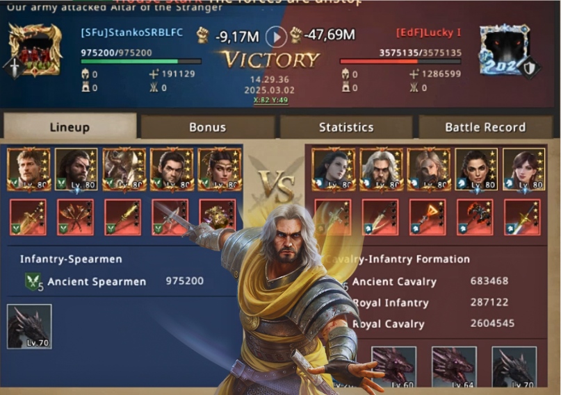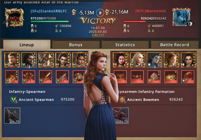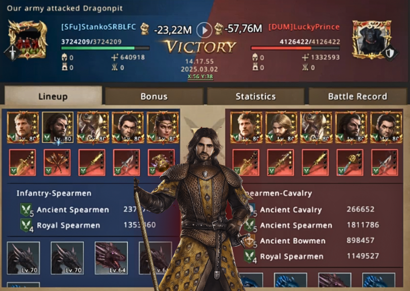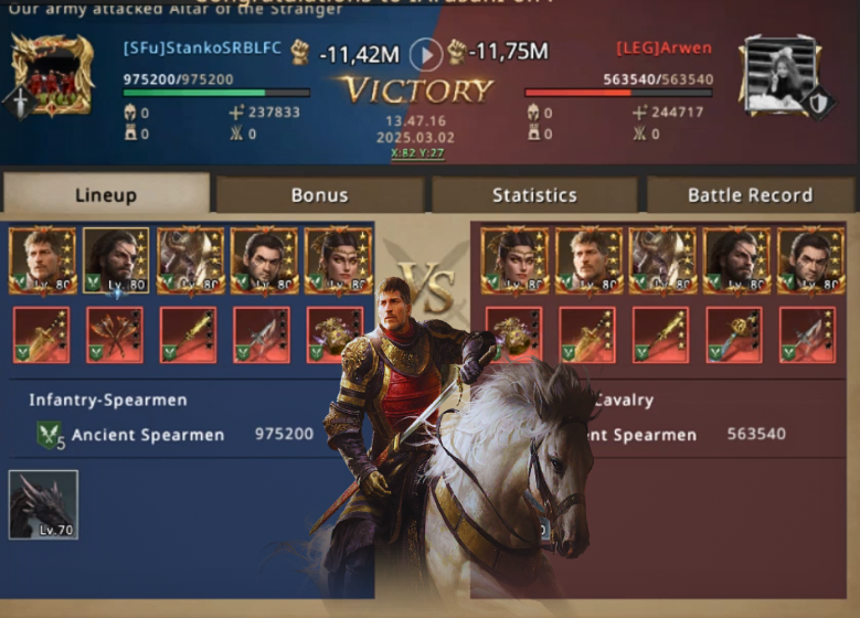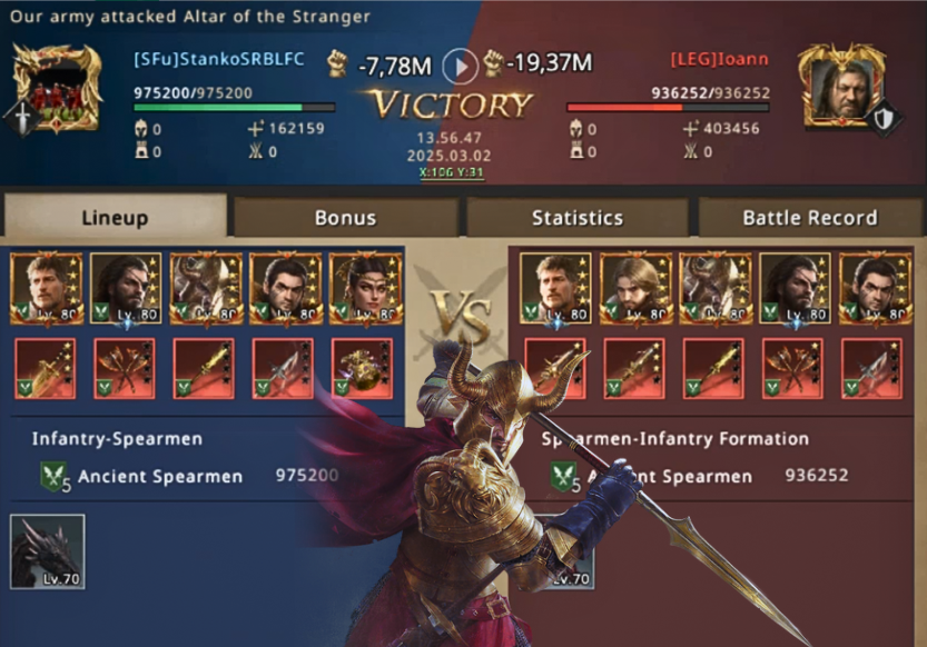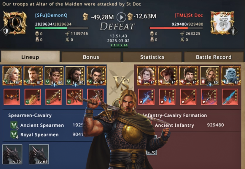 We managed to win 2 more Strangers, which we have never done before, and Stanko already saw in this that this will be an easy match and that we can reach Glory. In the fight for Maiden, we started with the same tactics, but Stanko soon changed his mind. DemonQ attacked the Lannister's Maiden and with Stanko's quick reaction he got additional spearmen which he thought would be enough to save the Maiden from the opponent's solo attacks. However, he was quickly dissuaded because he did not expect to have a player with NK and Vorian as his opponents. It was a very strong infantry player that DemonQ could hardly defend against.