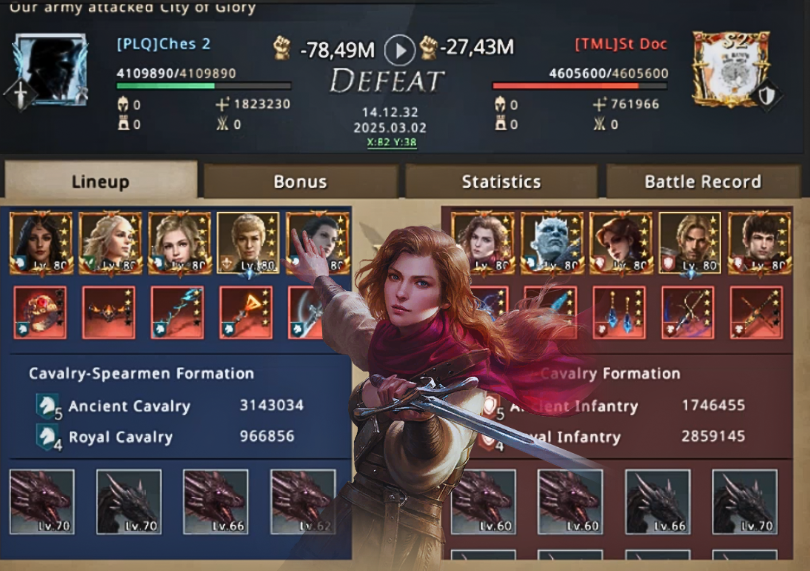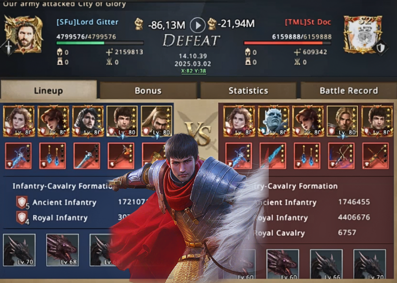 Seeing the report and that there were less than 4m infantry left, Stanko ordered Ches 2 to make a quick solo attack and try to knock the opponent out of Glory in the last seconds. Ches immediately went on the attack, but the opponent was quick and sent additional troops so that Ches sacrificed a large part of the cavalry against the 4m infantry. This was the only chance to save first place, but it would mean the risk of focusing too much on Glory and not paying attention to the defense of other buildings. Now it was necessary to preserve second place, which we had an 8k lead with less than 20 minutes to go.