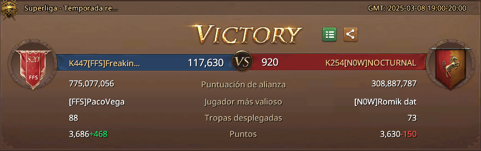 With a super-easy run, FFS secured 468 points, leaving the score at 117,630, and only 920 for NOW. The goal is to finish in the top three of the season, and despite a poor start, this allowed them to achieve these kinds of results. We'll see what FFS has in store in their upcoming matches and their preparations for the playoffs, where a strong performance is expected, so Latrasil begins their journey here...