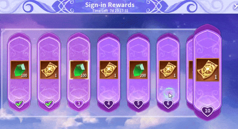 This is the easiest part of the event. All players have to do is sign in every day, navigate to the event section, and claim rewards. There are 10 rewards you can collect. Some days will give 100 Gems while others will give Tokens of Light which can be used in the Dazzling Wishes section. In total, players can get up to 800 Gems and 5 Tokens of Light.