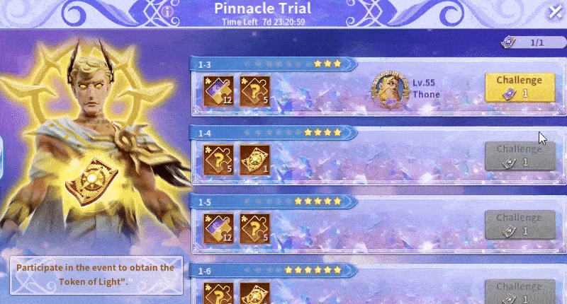 Pinnacle Trials are extremely similar to the Glorious Challenges except that players only get 1 attempt a day and cannot purchase additional tickets. The rewards are significantly better too. There are 10 levels and it offers gifts of 50 Random Immortal Fragments, 60 Random Holy/Shadow Immortal Fragments, and 5 Tokens of Light. After completing the levels, you can raid them to get additional rewards. The later levels are significantly more difficult since the enemies have legendary skills.