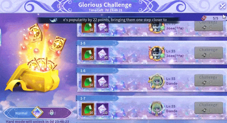 Glorious Challenges are similar to Well of Time campaigns. Players select a team to tackle each challenge and beating each challenge will net you Gems for first-time clear rewards and Goddesses Festival Coins that you can trade in for rewards in the Celebration Shop. Completing each level unlocks a raid feature. There are 2 modes. The Normal Mode is available at the start of the event and goes up to level 16. The levels are extremely easy and most players should not have much difficulty clearing them. The Hard Mode unlocks after 4 days and will be similar to the Elite Campaigns. You get 5 free attempts a day and it refreshes every day at 0 UTC. You can also purchase up to 35 additional attempts in the shop for 3,000 Gems, but I would save those for the Hard Mode levels for additional coins. Additionally, you can also get more Glorious Challenge Credentials from the Star of Popularity event by claiming Rare and Epic gifts. Players with the fastest clear times will appear on the level’s ranking ladder.