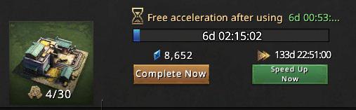 Over the next two days, I struggle to keep up with building and research. For the first time since starting these accounts, I run out of resources before speedups. Despite building full Mints and no Hospitals, my gold reserves are completely gone.