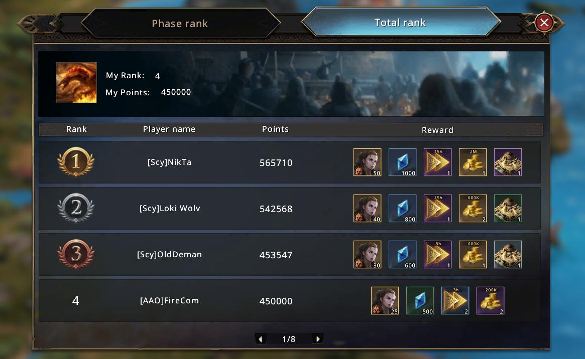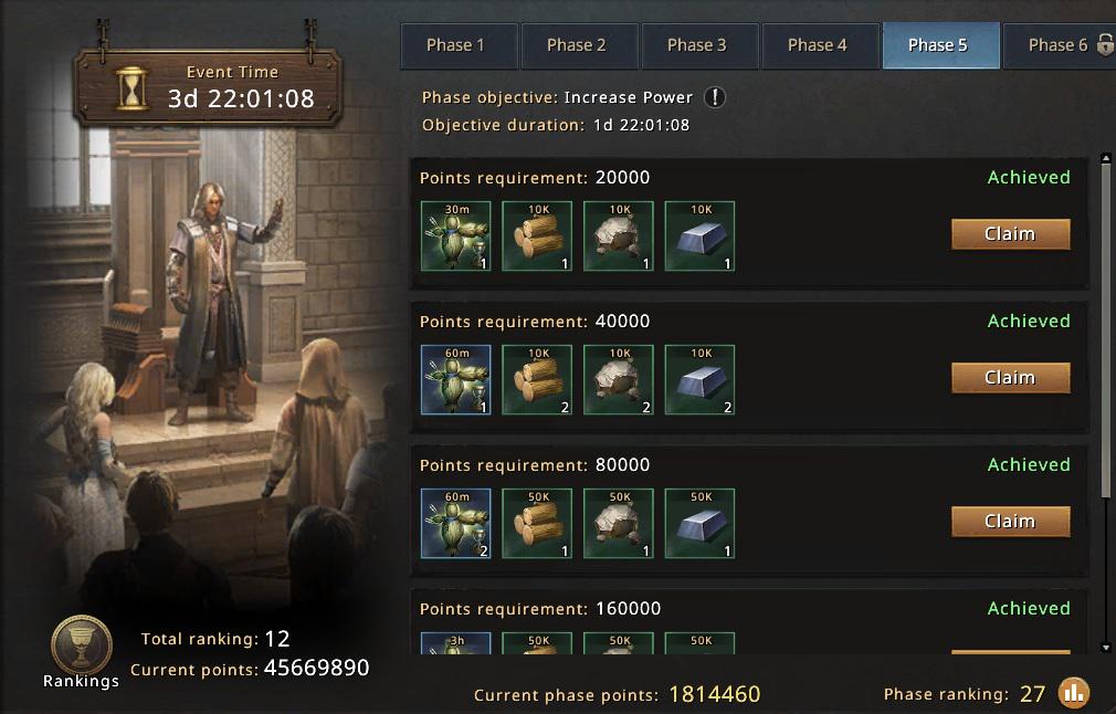 Phases 3 and 4 land right on my extended weekend, which means I barely get any points here. But that’s actually fine, I knew this overlap was coming. I don’t have the account power to train millions of troops like the big players, nor do I have an endless reserves of Motivation items to make a real impact in these phase rankings. Phase 4 in particular doesn’t even offer that many points compared to Phases 2 and 5, so I’m not too concerned about ranking low here.