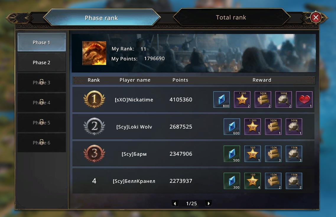 With some careful planning, stretching my last gold items and calculating the most efficient way to spend them between research, buildings, fortifications, and gear, I finally get back into the top 10 for both Phase 5 and the overall rankings.