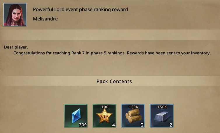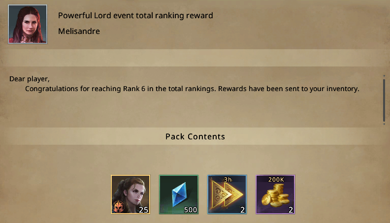 That being said, I didn't even notice when Lord of Lords ended. It used to be an event I genuinely enjoyed on my baby accounts, but now… not so much. The new kingdom experience isn’t as fun when there are no rules and everyone just does whatever they want. And with a huge account dropping in, it’s clear that top rankings in any event are now out of reach for us.