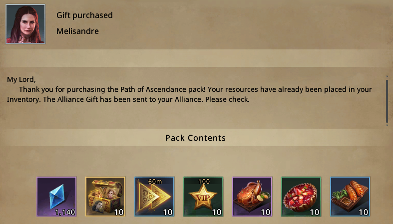 I’m so thirsty for points that I even cave and buy a pack to push Theon to Rare quality. The Anniversary event lined up perfectly, letting me grab several of his medals there. I was just 10 short. And despite my intention to keep these accounts 100% F2P...well, here we are.