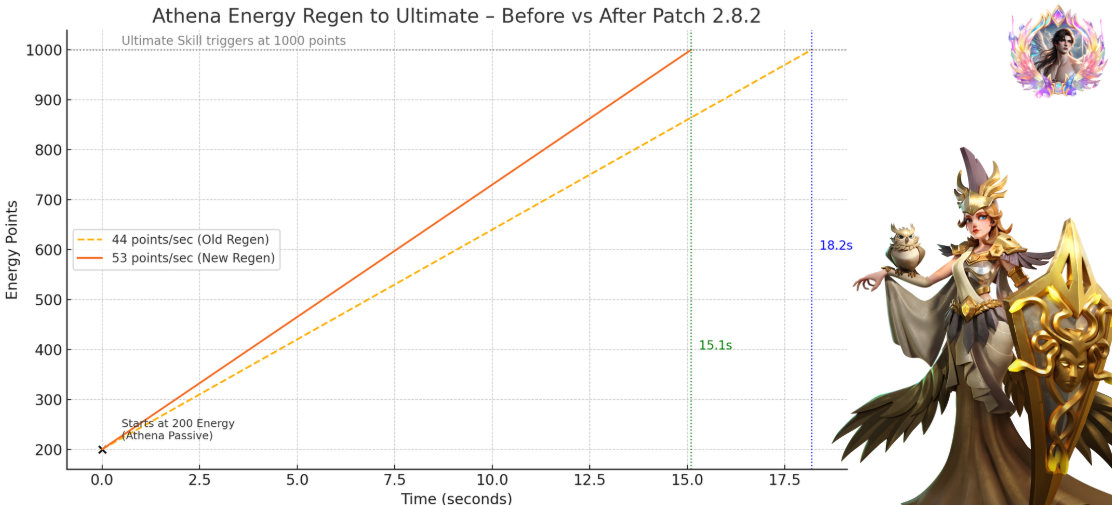 The chart below compares Athena’s energy regeneration before and after Patch 2.8.2 in a base-case scenario — no energy-boosting skills, artifacts, or buffs are applied. She starts at 200 energy thanks to her passive, and the Ultimate triggers at 1000. With the patch increasing her regen speed from 44 to 53 points per second, Athena now reaches her Ultimate roughly 3 seconds faster, giving her a noticeable edge in battle timing.