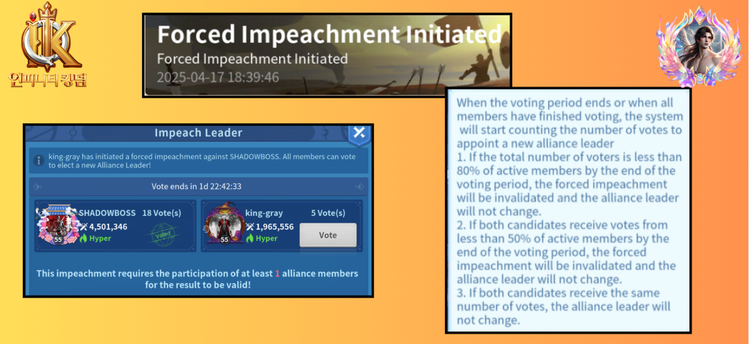 Voting weight is based on each member’s activity, and there’s a 7-day cooldown between impeachment attempts. During the voting period, the current leader temporarily loses some permissions (transfering leadership and cannot remove members - same for R5s), although members are free to leave voluntarily. Interestingly, new members can still be recruited during the process — and yes, they’ll be allowed to vote too, which could sway the results.
