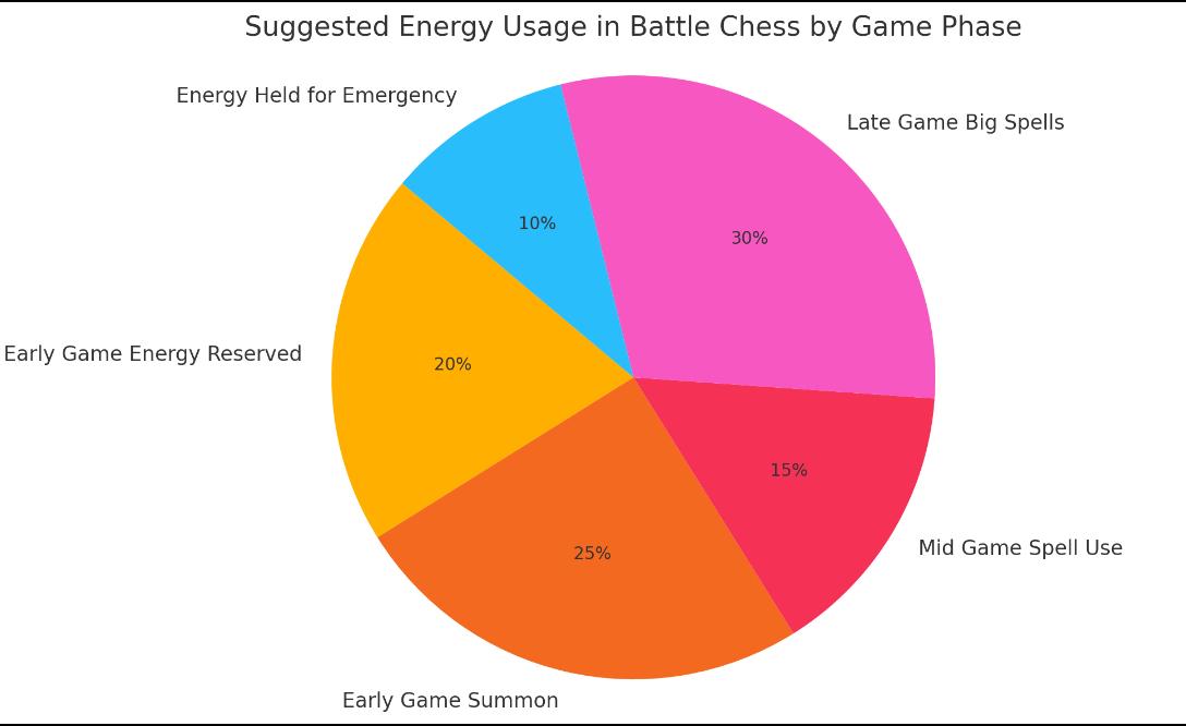 Here’s a pie chart showing the suggested energy usage throughout different phases of a Battle Chess match. It helps visualize how to manage your Energy Marks wisely from early game to the final Speed-Up phase.