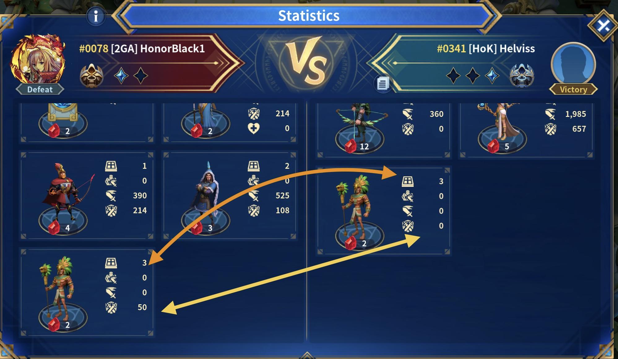 It is important to use tht battle stats, to help analyses how your build stacks up against enemy opponents. Here, we see that i won the match with overpowering DMG, compared to my Enemy opponent. My snipe did his job well and reduced the health points of the King, whereas enemies Robin attacked immortals. The RNG was on my side for that match!!