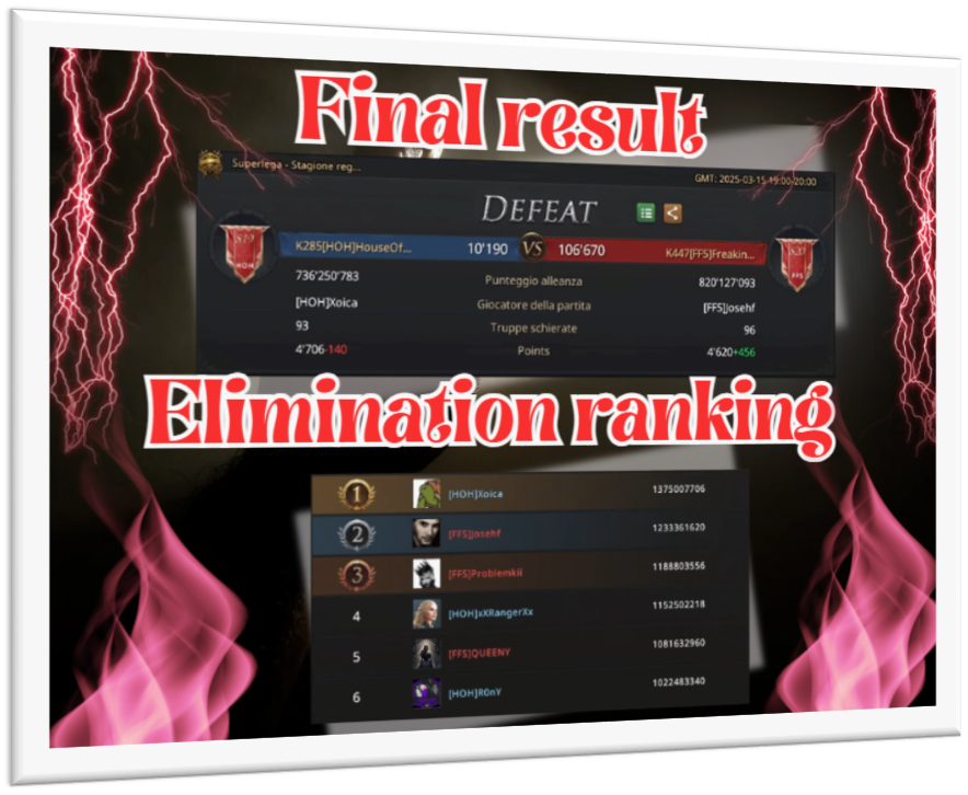 If I'm being honest with you, this battle wasn’t going to go in HOH's favor from the beginning. They have much stronger accounts and they have better weapons and commanders. I think HOH gave a good fight and they did all they could but in the end, FFS showed dominance throughout the match. This match ended as you must have realized by now with FFS as the winners, this was their 3rd win so far, so that goal was met. their next goal is to make it to the playoffs… will they? HOH already had 3 wins so far this season, and their next goal was the same as FFS, to make it to the playoffs, they were ranked lower than FFS so nothing is assured for them and they will have to bring their A game in the next 2 matches left in the regular season. They can’t afford to lose or they risk not making it, and that wasn't something they could accept. They weren't aiming to win the playoffs, they knew the chances were slim, there are stronger alliances with big accounts that have more chance to take the season, but they were hoping to get as far as they can in the playoffs. It's all they could hope for and they were ok with that.