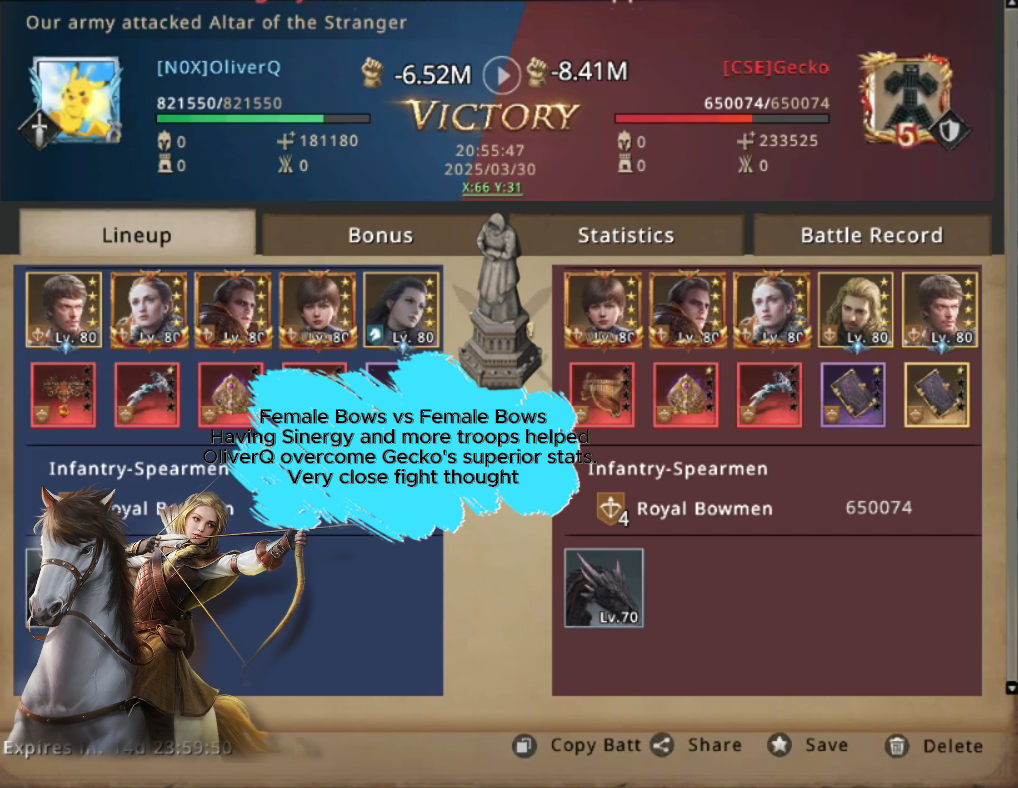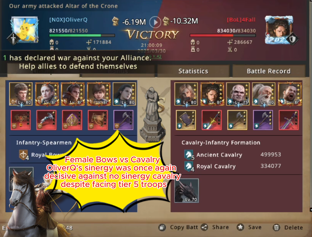 As he could mass only around 820.000 bows on his march, he decided to not even try to challenge the altar and moved on to other targets. It didn't take long, and he noticed that one of the House Greyjoy's altars is being occupied and decided to try and stop that. He challenged [BoL]4Fall's cavalry to a fight and as the battle started his bowmen started launching arrows but unfortunately, 4Fall's cavalry was well defended by the walls. But then 4Fall, feeling confident, did a critical mistake and opened the gates to try and charge OliverQ's archers.