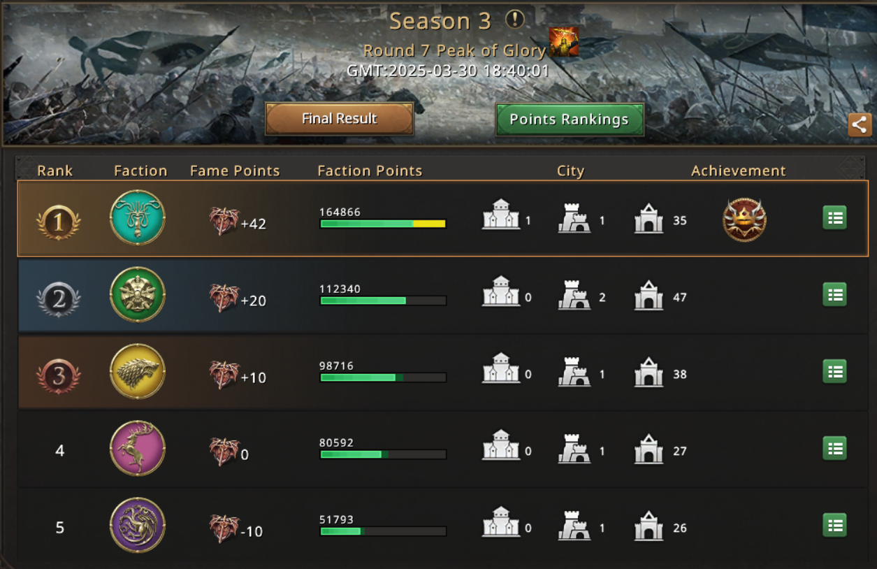 [YGI]Henker12 managed to occupy the City of Glory for House Greyjoy and then hell broke loose. All the houses started sending rallies from all sides of the map and combined with the fact that House Greyjoy didn't have any catapults in their possession made things even worse for the team. They even lost the City of Glory a few times but their determination and will to keep fighting for it was higher than everyone's else. It was the bloodiest fight OliverQ ever seen in Arena of Honor, every time the catapults were launching their massive boulders there were so many wounded troops inside the city. It was only the whole team's determination to heal the troops and keep sending reinforcing marches that settled the battle in their favor at the end of the battle and gave them a well-deserved 1st place.