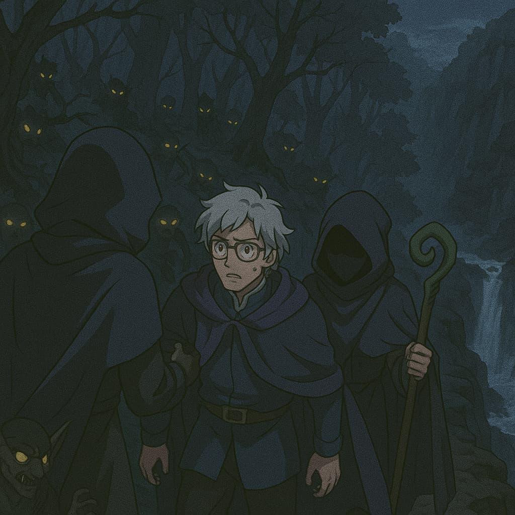 The figure's face was hidden by a cowl embroidered with strange, ancient runes. Only their gauntleted hands could be seen — fingers inlaid with silvery veins, pulsing with forbidden magic.