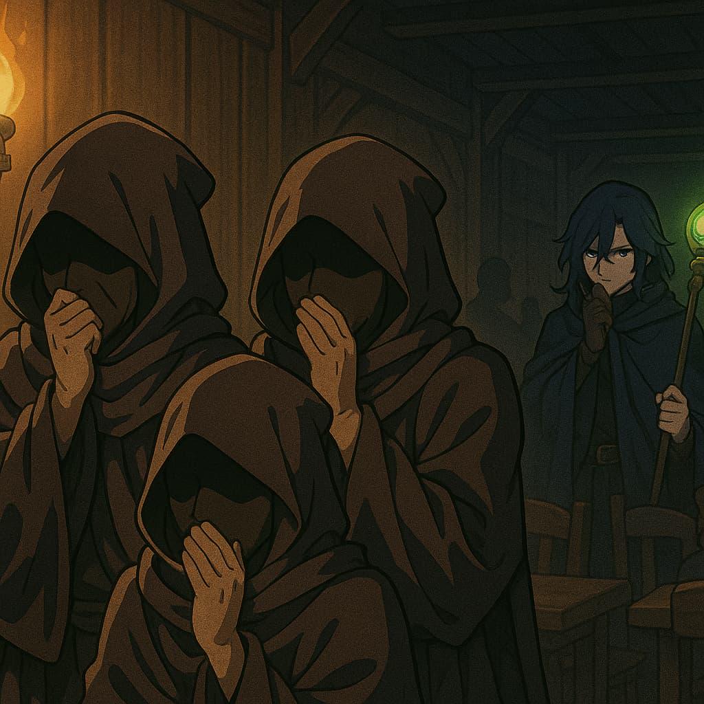 Their faces were hidden behind cloaks, hands cupped over their mouths, casting furtive glances around the tavern to ensure they were not seen.