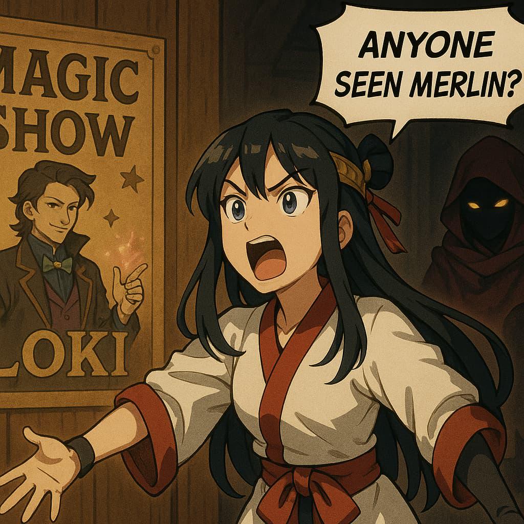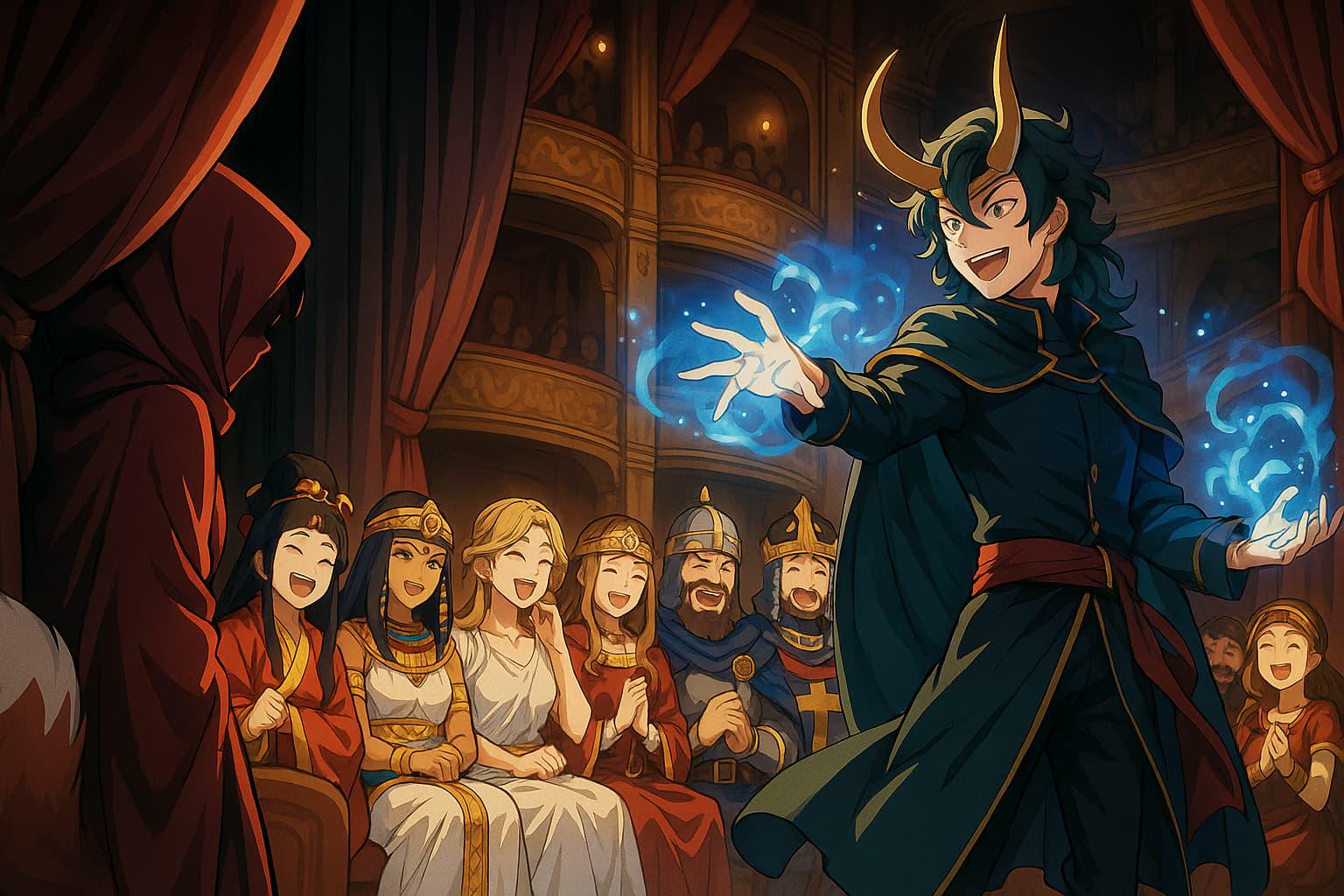 Loki — gleeful and mischievous — took the stage under the crumbling chandeliers, ready to perform his famed illusion act. A thin mist of magic sparkled in the tavern as he conjured twenty Lokis, each bickering loudly, swapping faces, shapes, and genders, while throwing glittering void orbs through the air.