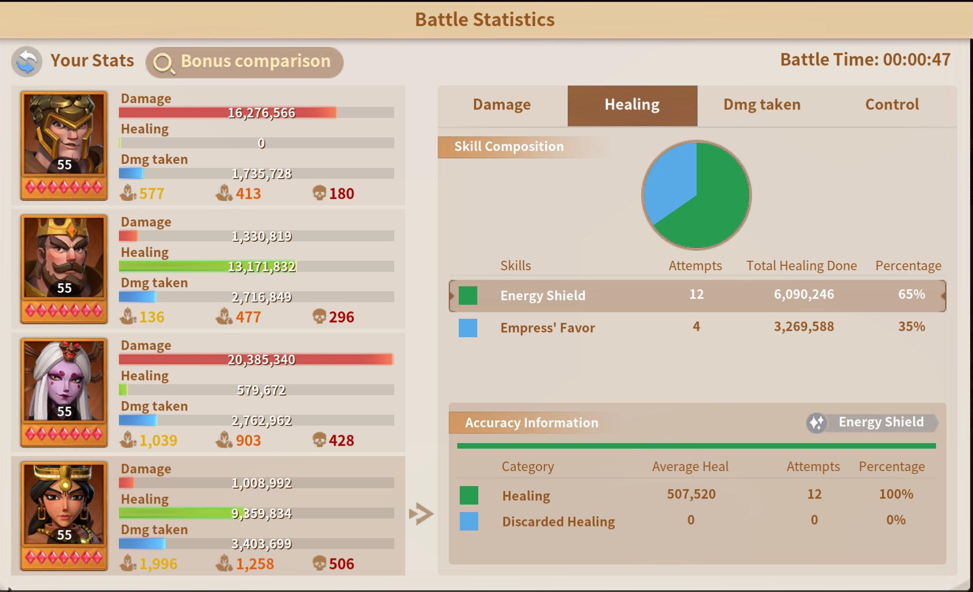The synergy between Spring of Life and Energy Shield was critical here. Spring of Life, when paired with a strong defensive skill, doesn’t just passively enhance healing — it becomes a true force multiplier. With Spring of Life fully maxed, every heal provides a 25% bonus to all allied healing received, significantly increasing the march’s endurance over time. The healing accuracy being at 100% meant that every healing skill landed cleanly, allowing the formation to recover from incoming damage without falling behind.