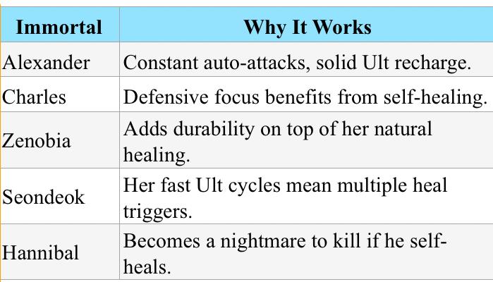 - Tanky Frontlines: Helps tank immortals like Alexander, Charles, or Hannibal stay up without needing external healing.