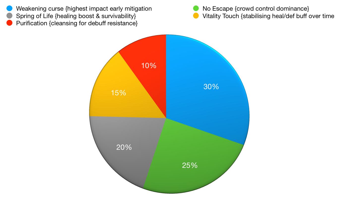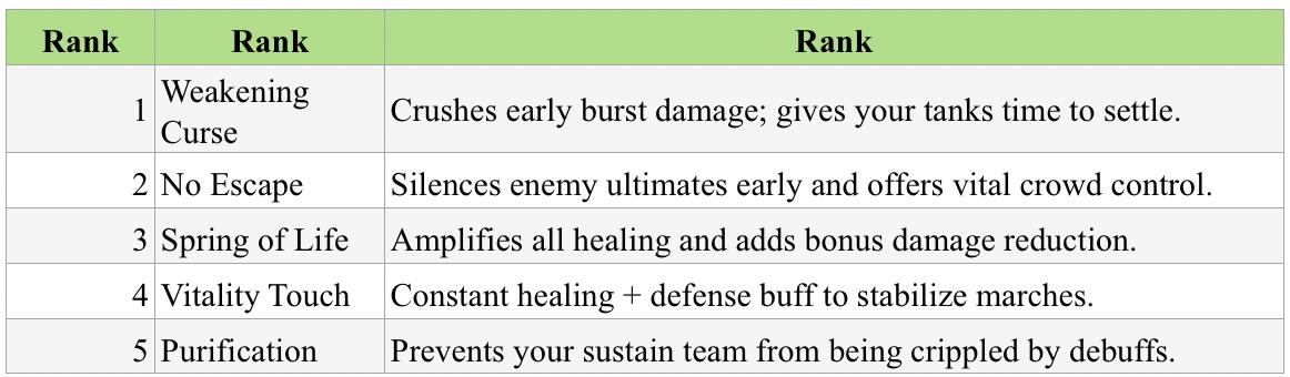 - Every skill picked must either stall, heal, protect, or cleanse during that early-to-mid battle phase.