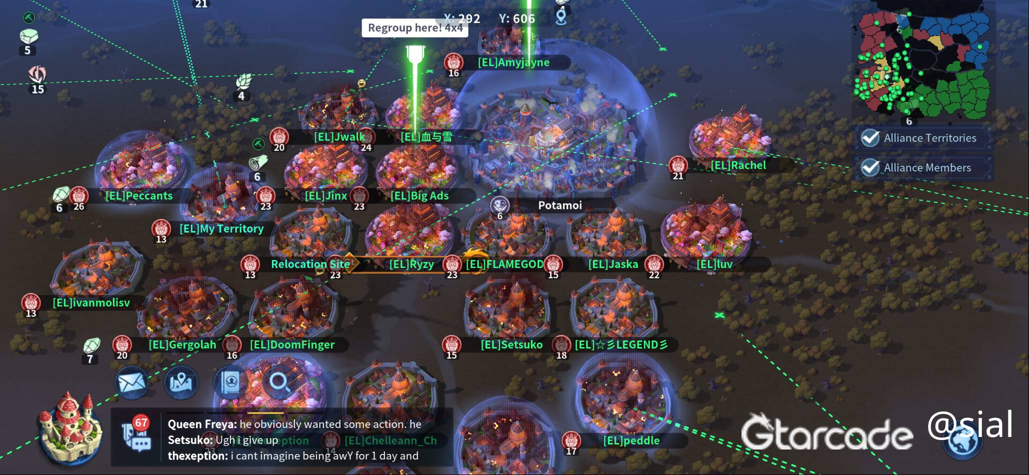The current situation in the game is that players are positioned in their respective territories, with some players regrouping or coordinating their actions. The presence of a "Regroup here!" message and the chat window displaying player messages suggests a dynamic and interactive environment. Players are likely working together or competing against each other, making strategic decisions and managing resources to achieve their goals.