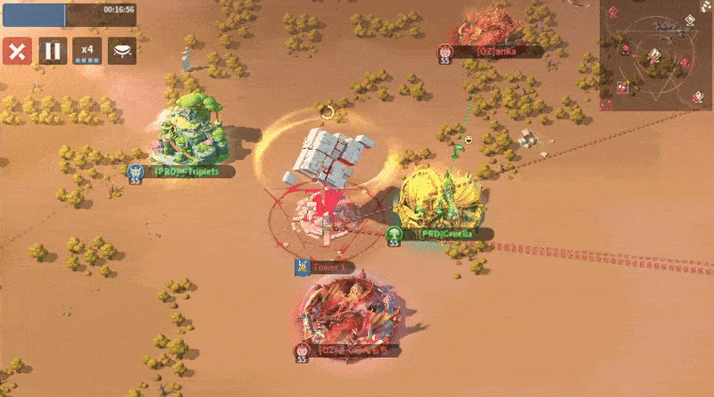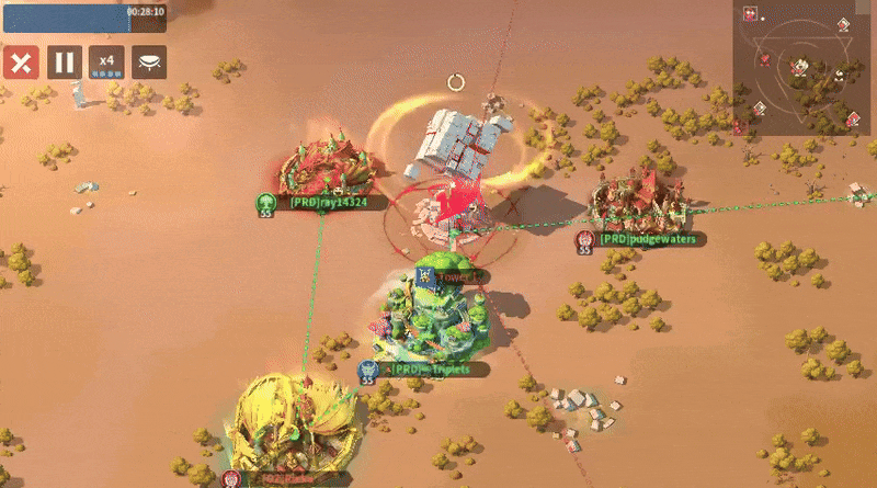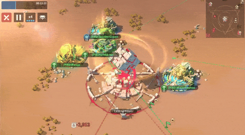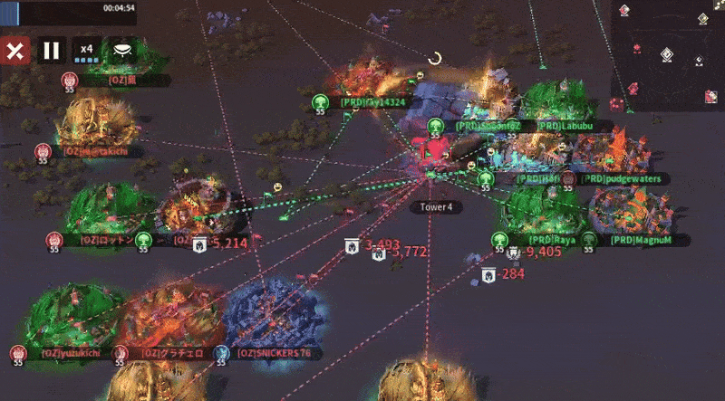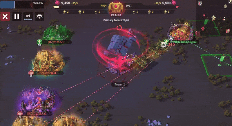 PRD sent six players to Tower 1 and OZ responded with five. PRD set up a tight formation directly around the tower, claiming all three of the first-row tiles. OZ, on the other hand, avoided the tower like the plague. None of their players were next to the tower. Their players were spread out and not in range to contest the tower effectively. OZ should have moved next to the tower to disrupt PRD’s attempts to capture the tower. If OZ doesn’t send a strong member to Tower 1, PRD could take it uncontested. The silver lining is that PRD won’t be able to destroy any relocations.