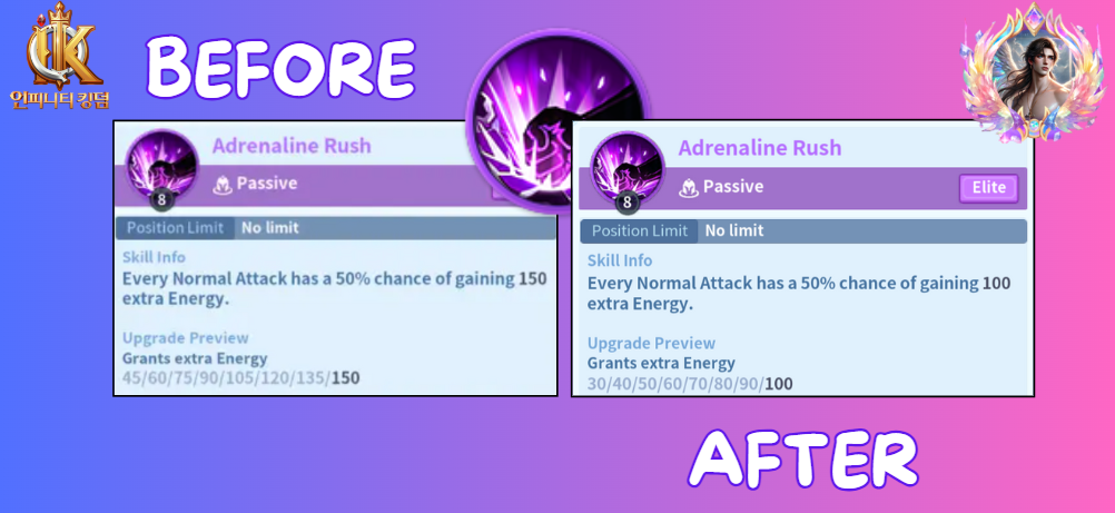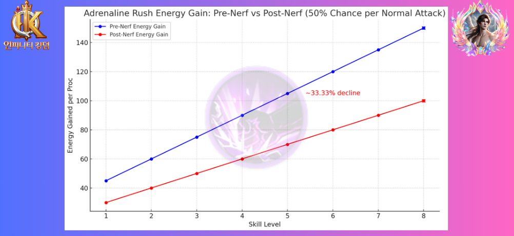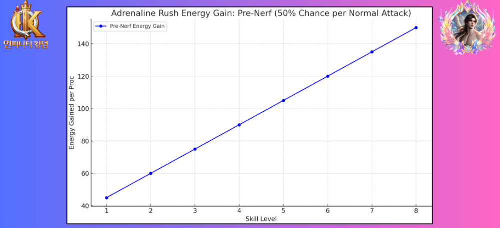 Before the nerf, Adrenaline Rush offered a 50% chance per normal attack to grant a flat energy bonus. The formula was straightforward: 45 base energy plus 15 per skill level.
