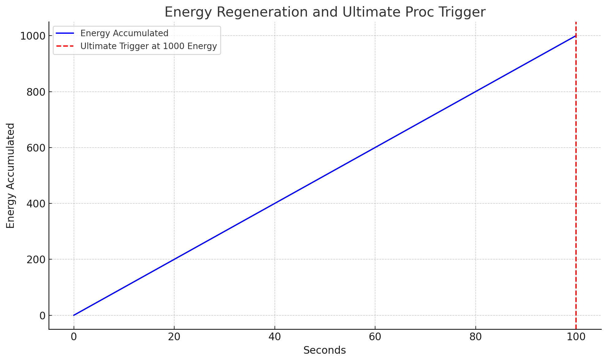 Patch 2.8.1 reworked the formula to: 30 base energy plus 10 per skill level. At level 8, this now results in 30 + 10×7 = 100 energy per proc.